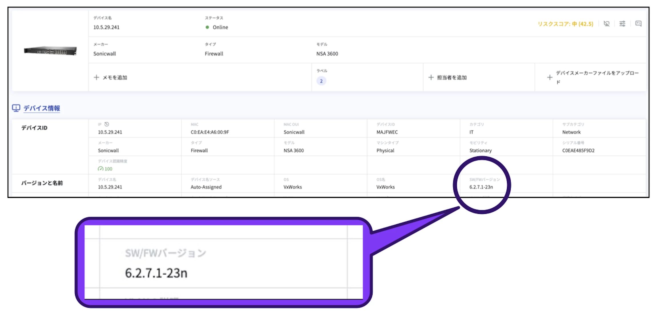 院内のトラッフィク分析からファイアーウォールのOSのバージョンを特定した例OSのバージョン変更を検知した場合に管理者にアラート通知することも可能